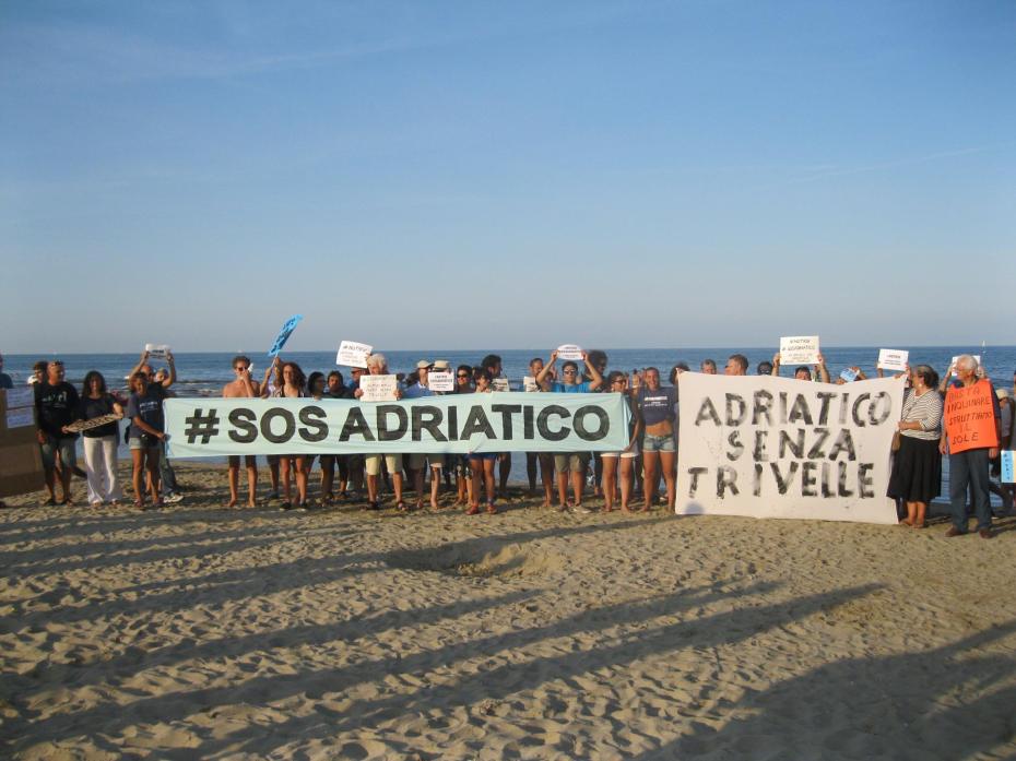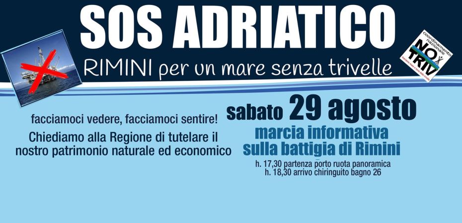 Pod navedenom parolom grupacija Sos Adriatico Rimini (akronim koja okuplja desetke udruga i odbora za zaštitu okoliša pokrajine) danas, subota u 17:30, iz luke Rimini, pokrenula je miran prosvjedni marš: za more bez bušotina.